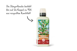 Wir bei Plantura legen grossen Wert auf eine klimafreundliche und ressourcenschonende Produktion. Da uns die Umwelt sehr am Herzen liegt, möchten wir eine nachhaltige Alternative zu herkömmlichen Düngern bieten. Deshalb besteht die Verpackung unseres Bio-Flüssigdüngers – mit Ausnahme der Kappe – zu 95% aus recyceltem Kunststoff (HDPE). Wenn Sie unseren Bio-Beeren- & Obstbaumdünger kaufen, erhalten Sie einen rein pflanzlichen Bio-Dünger, welcher ohne tierische Inhaltsstoffe auskommt.
