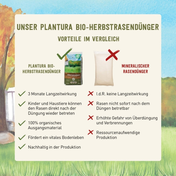 Es handelt sich bei unserem Plantura Herbstrasendünger um einen organischen Langzeitdünger aus 100% natürlichen Inhaltsstoffen. Enthalten sind Mehl von Ölkuchen aus Soja und Traubenkernen, Kakaoschalen, Weizenglutenmehl und Vinasse. Diese Zusammensetzung ist selbstverständlich für den biologischen Landbau zugelassen (EG Nr. 889/2008) und frei von tierischen Rohstoffen wie Kot oder Schlachtabfällen. Unser Plantura Herbstrasendünger ist also vegan und komplett tierfrei.