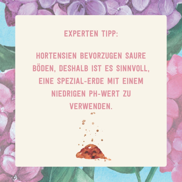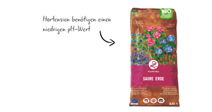 Neben einer angepassten Düngung sollten Sie auch bei der Erde die besonderen Ansprüche der Hortensien beachten. Denn Hortensien sind sogenannte Moorbeetpflanzen und können nur in einem Boden mit niedrigem pH-Wert, also einem sauren Milieu, gesund und kräftig wachsen. Für Hortensien und alle anderen Moorbeetpflanzen (zum Beispiel Rhododendren und Blaubeeren) sollten Sie deshalb eine spezielle Erde wie unsere Plantura Bio-Saure Erde verwenden.