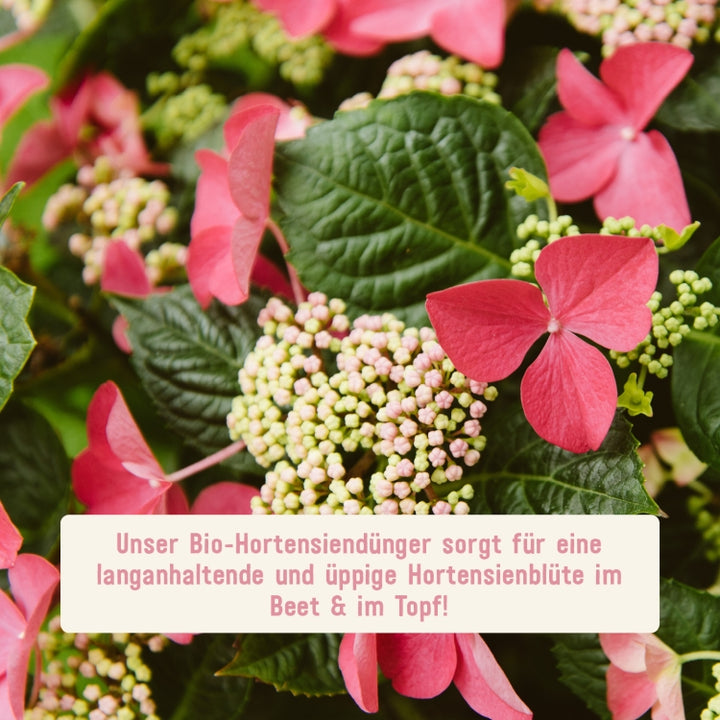 Unser Bio-Hortensiendünger überzeugt mit seinem speziell angepassten NPK-Verhältnis von 5-2-7,5+2 MgO + Fe. Dieses kommt den Ansprüchen der Hortensien entgegen: Hortensien haben einen hohen Nährstoffbedarf und benötigen vor allem Stickstoff (N) und Kalium (K). Für ein kräftiges, grünes Blattwerk und damit keine Mängel auftreten, sorgen 2% Magnesium und 1% Eisen. Durch den hohen Gehalt an organischen Ausgangsstoffen unterstützt unser Bio-Dünger langfristig beste Bedingungen für Ihre Hortensien. Deren Zersetzung regt nämlich ein gesundes Bodenleben an.