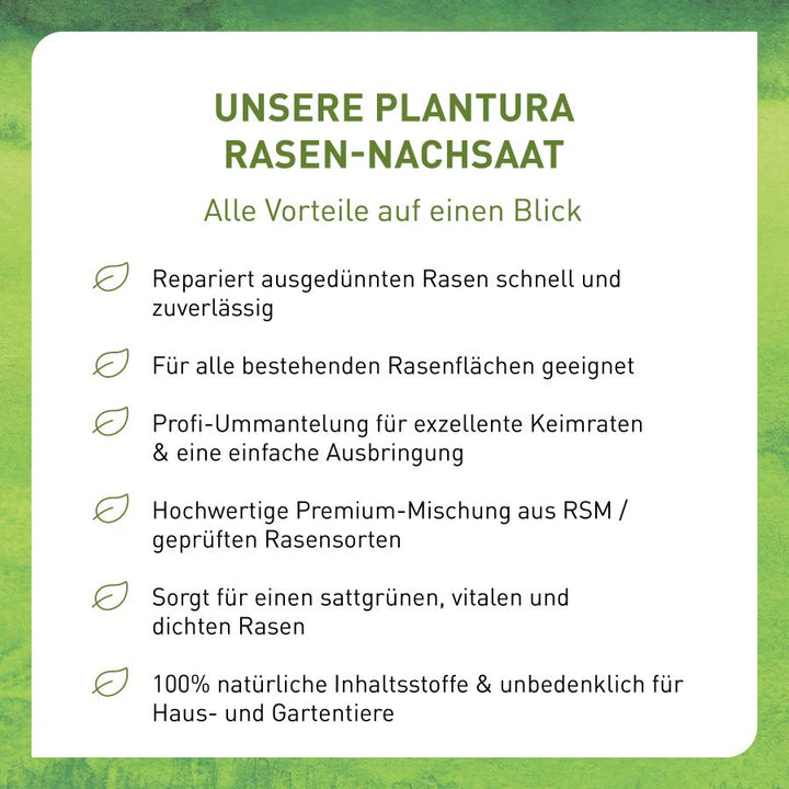 Unserer Rasen-Nachsaat enthält ausschliesslich hochwertiges, RSM / geprüftes Saatgut und trägt das LUFA-Siegel. In der Saatgutmischung sind ausgewählte Sorten der Rasenart Lolium perenne enthalten, welche für ihre hohe Regenerationsfähigkeit und schnelle Keimung bekannt sind. So bessert unsere Plantura Rasen-Nachsaat Ihren Rasen schnell und zuverlässig aus und macht die Gräser wieder konkurrenzstark und saftig-grün.